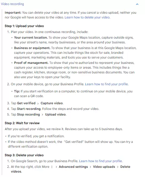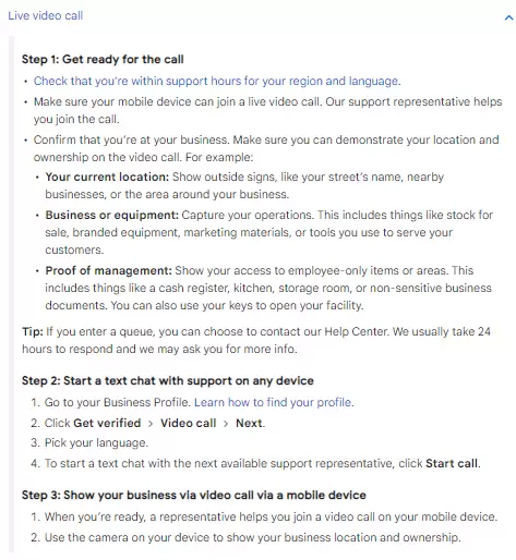 Make sure your mobile device can join a live video call. Our support representative will help you join the call. Make sure you can demonstrate your location and ownership on the video call. Confirm that you’re at your business.