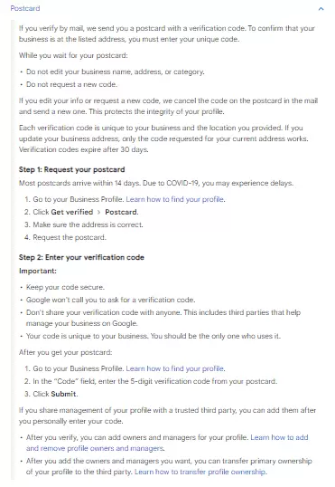 We will send you a postcard with a verification code if you verify by mail. You must enter your unique code to confirm that your business is at the listed address. While you wait for your postcard: Do not edit your business name, address, or category.
